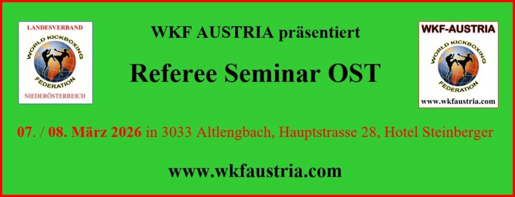 Unser Österreichischer Verband WKF AUSTRIA und die WKF Landesverbände Wien und Niederösterreich laden alle Österreichischen Vereine ein ihre Mitglieder zum nächsten Referee Seminar 2026 anzumelden.